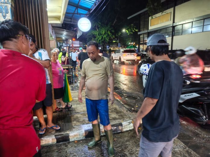 Sementara di sektor hilir, ia menyoroti sistem drainase perkotaan yang dianggap tidak fungsional secara sistemik. Salah satu contoh nyata terlihat di kawasan Timur Pasar Baru (area food court). Air menggenang tinggi karena saluran pembuangan mengalami kebuntuan.