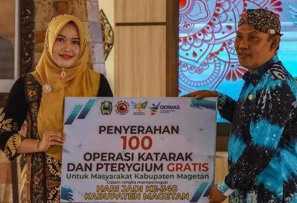 Magetan,seputarjatim.co.id-Dalam rangka memperingati hari jadi Kabupaten Magetan Ke-348,Pemkab Magetan yang bekerjasama dengnan Klinik EDC menggelar bakti sosial gerakan mata sehat dan juga penyerahan 100 operasi katarak dan pterygium gratis untuk masyarakat Magetan di Pendapa Surya Graha, Kamis (26/10/2023).