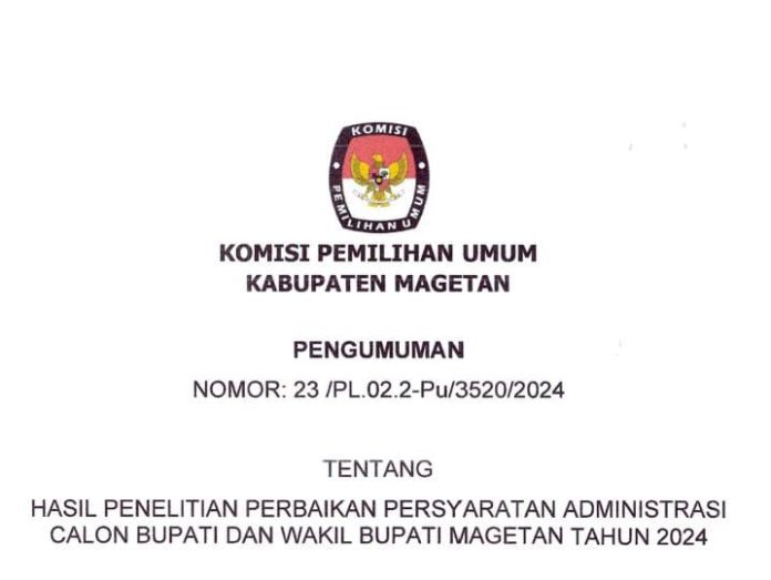 Surat pengumuman tersebut mengumumkan bahwa tiga Bapaslon Pilkada kabupaten Magetan 2024 dinyatakan memenuhi syarat.
