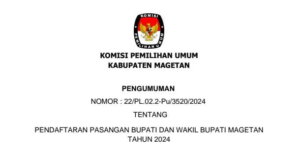 Magetan,seputarjatim.co.id – Komisi Pemilihan Umum Kabupaten Magetan umumkan bahwa Pendaftaran pasangan Bupati dan wakil Bupati Kabupaten Magetan 2024 akan di buka mulai Selasa 27 Agustus hingga Kamis 29 Agustus 2024.