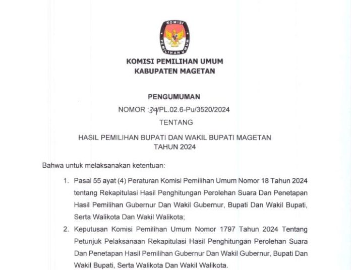 Keputusan Komisi Pemilihan Umum Kabupaten Magetan tentang penetapan Hasil Pemilihan Bupati dan Wakil Bupati Magetan tahun 2024 dapat diunduh di https://s.id/SKHASILMGT24.(ryn)