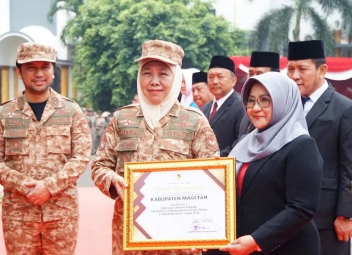 Prestasi ini dikukuhkan dalam upacara peringatan Hari Bela Negara yang berlangsung khidmat di Halaman Gedung Negara Grahadi, Surabaya, pada Jumat (19/12/2024). Penghargaan bergengsi tersebut diserahkan langsung oleh Gubernur Jawa Timur kepada Bupati Magetan Nanik Sumantri yang akrab disapa Bunda Nanik.