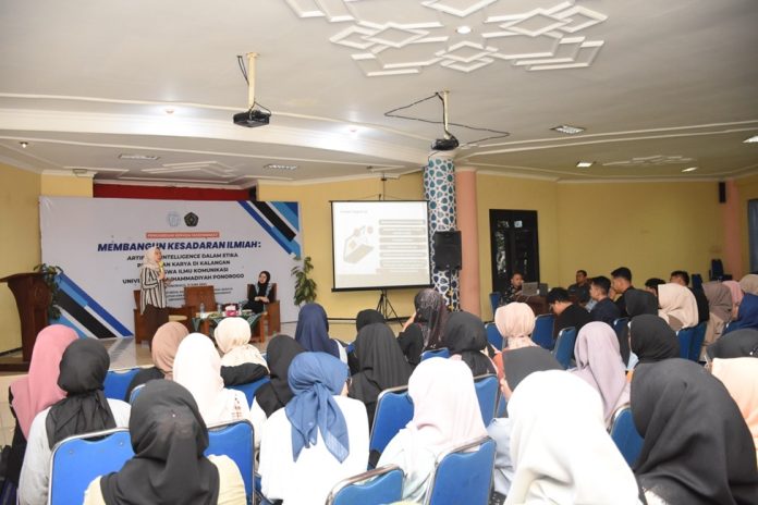 ChatGPT berpotensi dalam mengabaikan berbagai etika ilmiah dan kaidah dalam penulisan sebuah karya tulis. Oleh karenanya, Research Group Media, Khalayak dan Sistem Sosial Budaya FISIP UNS berkolaborasi dengan Program Studi Ilmu Komunikasi FISIP Universitas Muhammadiyah Ponorogo berkolaborasi menggelar pengabdian kepada masyarakat bertajuk “Membangun Kesadaran Ilmiah: Artificial Intelligence dalam Etika Penulisan Karya di Kalangan Mahasiswa Ilmu Komunikasi Universitas Muhammadiyah Ponorogo” yang diselenggarakan di Aula Universitas Muhammadiyah Ponorogo,Selasa(11/06/2024)