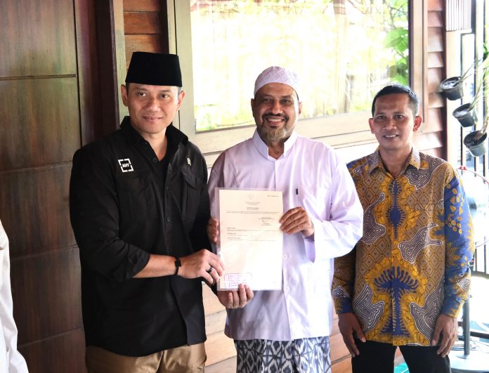 Pasuruan,seputarjatim.co.id – Menteri Agraria dan Tata Ruang/Kepala Badan Pertanahan Nasional (ATR/BPN), Agus Harimurti Yudhoyono (AHY) menyerahkan 52 Sertipikat Tanah Elektronik hasil program Pendaftaran Tanah Sistematis Lengkap (PTSL) di Desa Ranggeh, Kecamatan Gondangwetan, Kabupaten Pasuruan, Kamis (26/09/2024). Dalam kesempatan ini, Menteri AHY juga bertemu dengan Habib Taufiq bin Abdul Qodir Assegaf yang memimpin Rabithah Alawiyah.