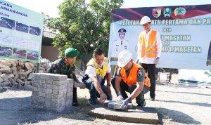 Magetan,seputarjatim.co.id – Peletakan paving block oleh Bupati Magetan Suprawoto dan Dandim 0804/Magetan Letkol Inf Dani Indrajaya, S.I.P, di Taman Dharmawangsa sebagai bentuk dimulainya pembangunan untuk memperindah Taman Dharmawangsa sebagai salah satu taman kota di Kabupaten Magetan.