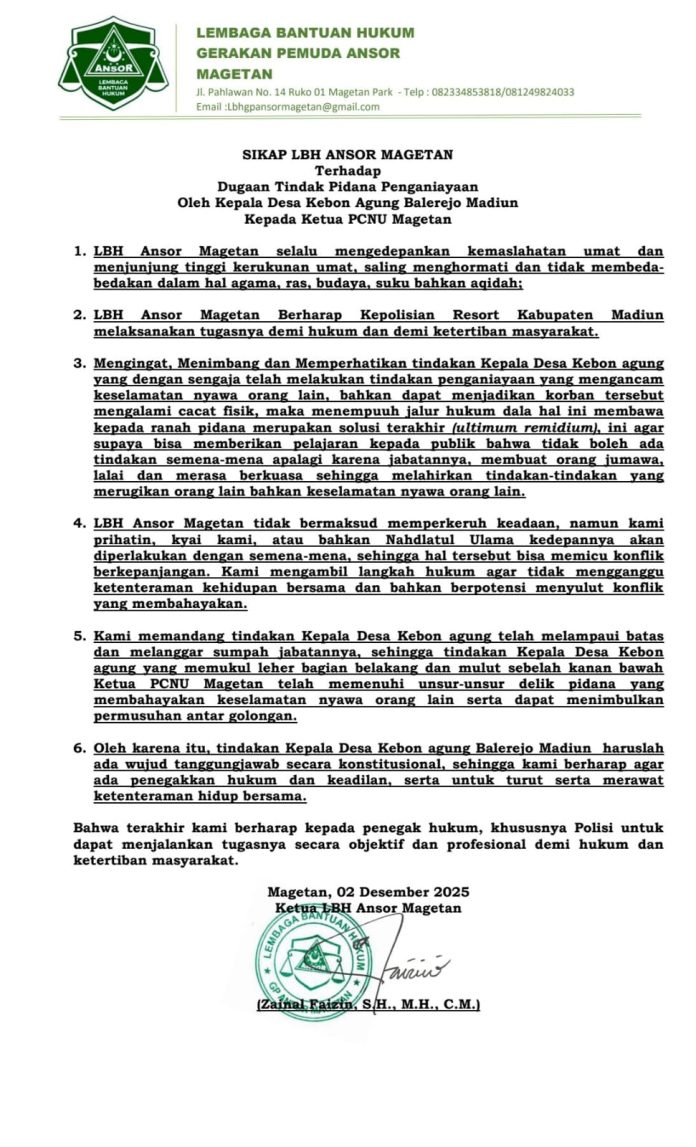 Ansor Magetan segera mengambil langkah hukum. Mereka telah menginstruksikan Lembaga Bantuan Hukum (LHB) Ansor untuk segera memberikan advokasi hukum dan memastikan pengawalan kasus ini hingga tuntas.