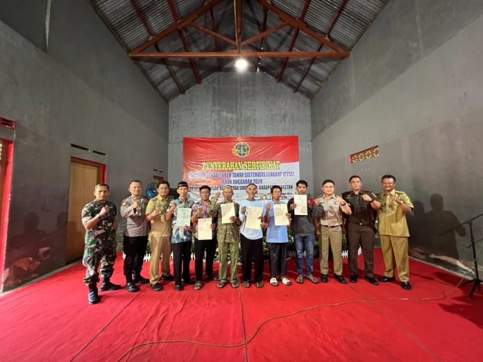 Magetan,seputarjatim.co.id – Pemerintah kembali menorehkan pencapaian penting dalam pelayanan kepada masyarakat melalui Program Pendaftaran Tanah Sistematis Lengkap (PTSL). Pada tahun 2024, sebanyak 623 bidang tanah telah berhasil disertipikasi dan diserahkan kepada warga Desa Kentangan, Kecamatan Sukomoro, Kabupaten Magetan. Acara penyerahan berlangsung di Balai Desa Kentangan dan dihadiri oleh berbagai pejabat daerah.