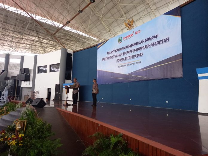Magetan,seputarjatim.co.id – Pj Bupati Magetan,Hergunadi lantik dan serahkan SK kepada 1.432 PPPK (Pegawai Pemerintah dengan Perjanjian Kerja),Formasi tahun 2023 diantaranya 1.123 Guru,206 tenaga kesehatan,dan 98 tenaga teknis,kegiatan tersebut dilaksanakan di Gor Ki Mageti Magetan,Selasa(30/04/2024)