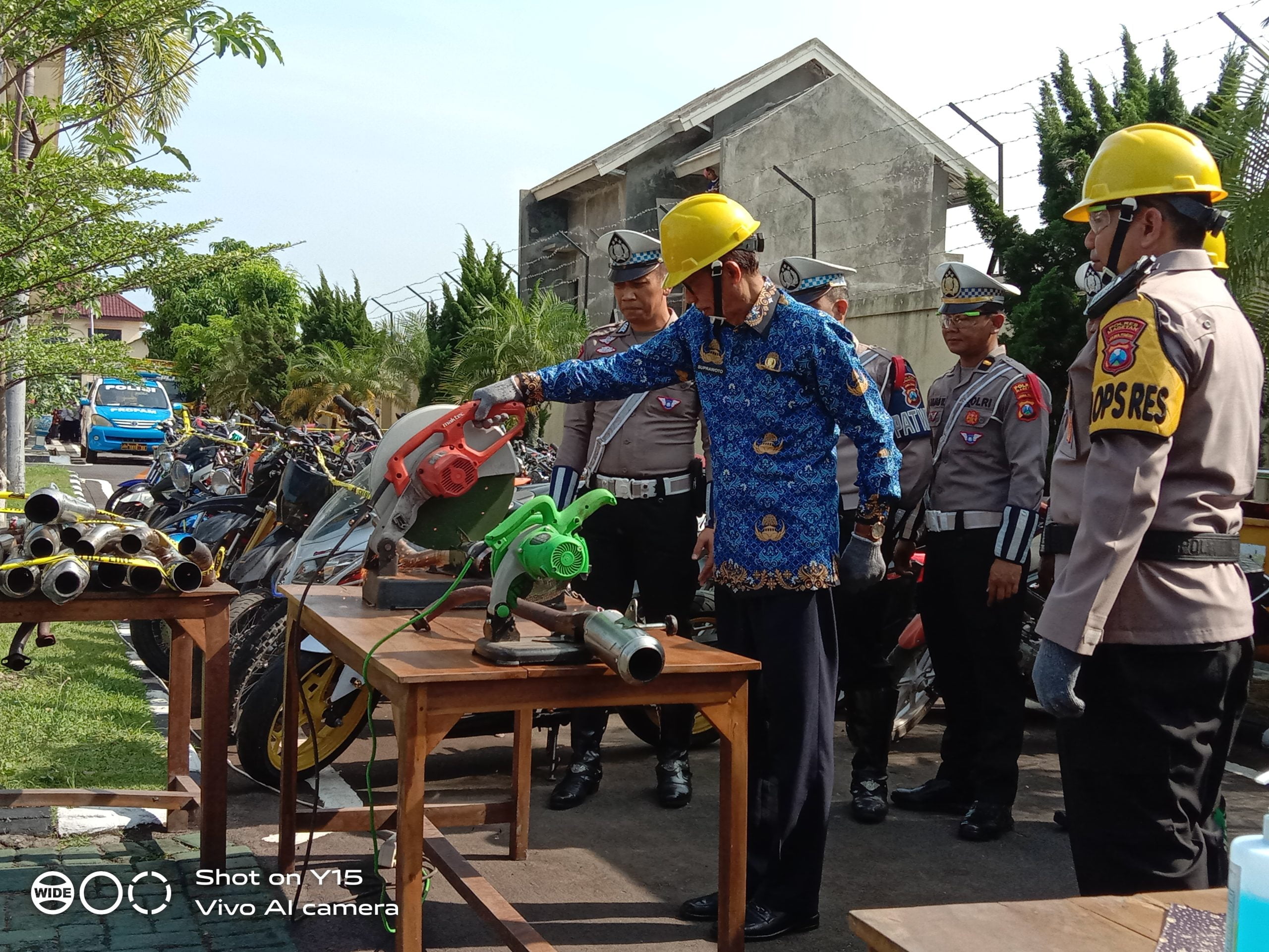 Kapolres Magetan AKBP Muhammad Ridwan juga menyampaikan penindakan pelanggaran lalu lintas knalpot brong juga dimusnahkan hari ini. Ratusan knalpot brong ditumpuk di atas meja dan di Musnahkan dengan gergaji mesin.