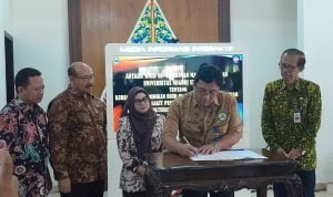 Direktur RSUD dr Sayidiman Magetan dr Rochmad Santosa saat menandatangani kerjasama dengan Unesa yang di saksikan Bupati Magetan Suprawoto