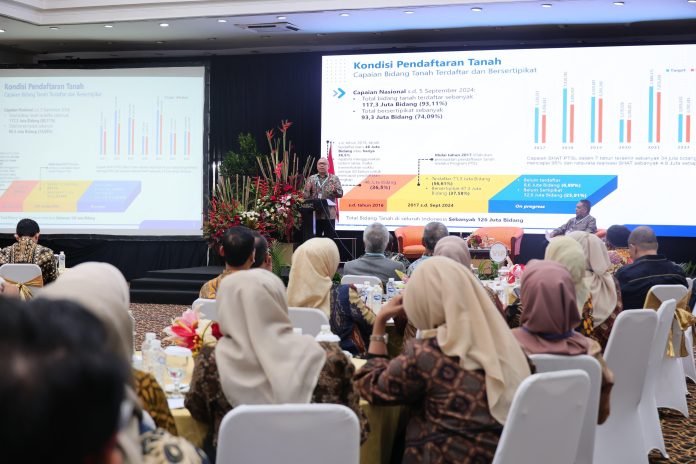 Bandung,seputarjatim.co.id – Seiring implementasi Sertipikat Tanah Elektronik atau Sertipikat-El, Kementerian Agraria dan Tata Ruang/Badan Pertanahan Nasional (ATR/BPN) terus berupaya menyosialisasikan soal sertipikat ini ke masyarakat, termasuk kepada praktisi kadastral, Pejabat Pembuat Akta Tanah (PPAT), dan akademisi. Hal ini disampaikan Sekretaris Jenderal (Sekjen) Kementerian ATR/BPN, Suyus Windayana saat menjadi _keynote speaker_ dalam Seminar Nasional yang diselenggarakan oleh Masyarakat Ahli Survei Kadaster Indonesia (MASKI), di Hotel Horison Bandung pada Sabtu (14/09/2024).
